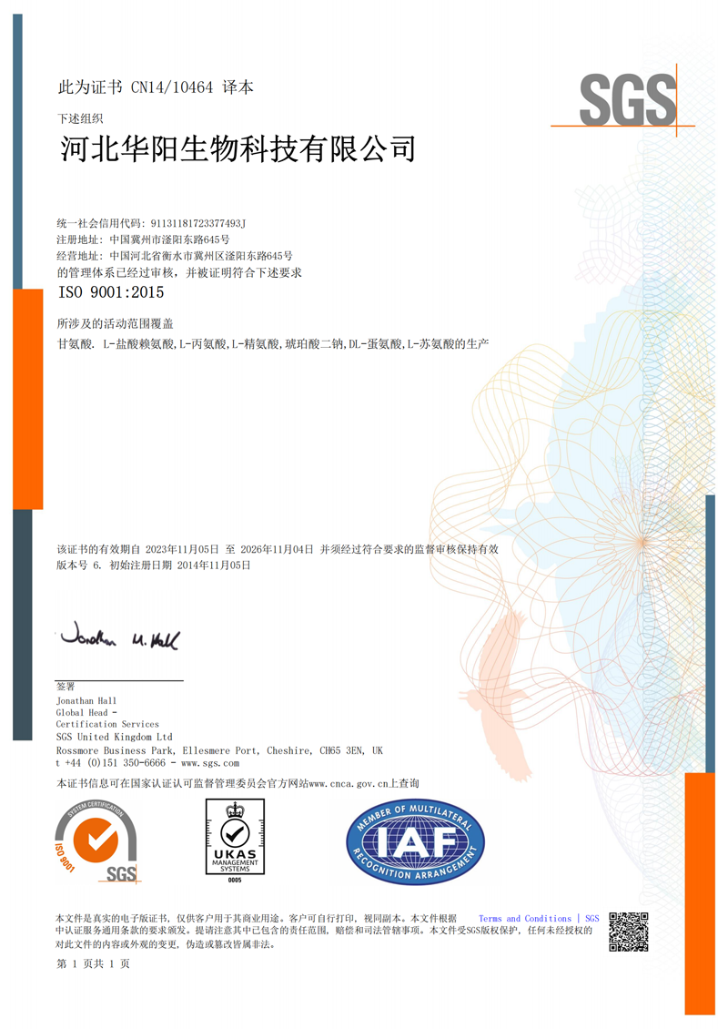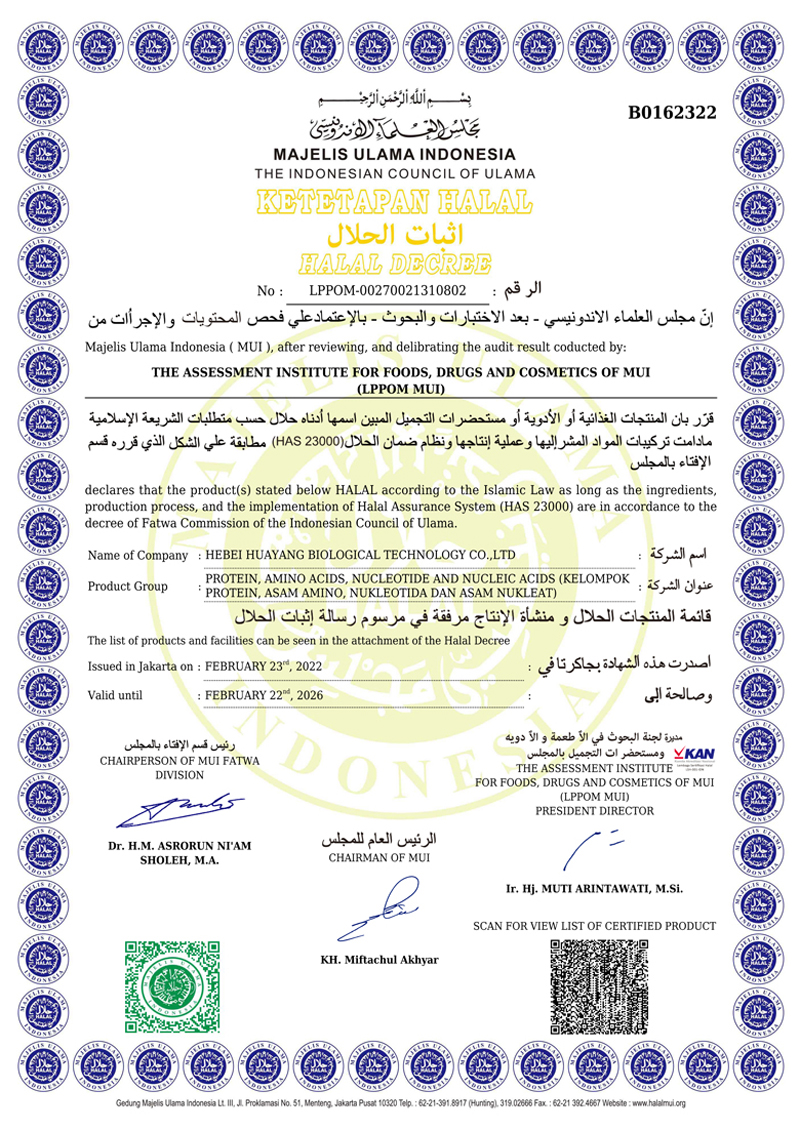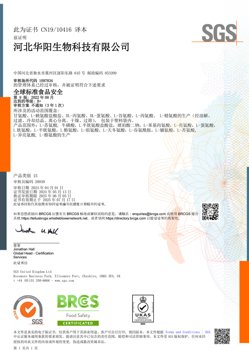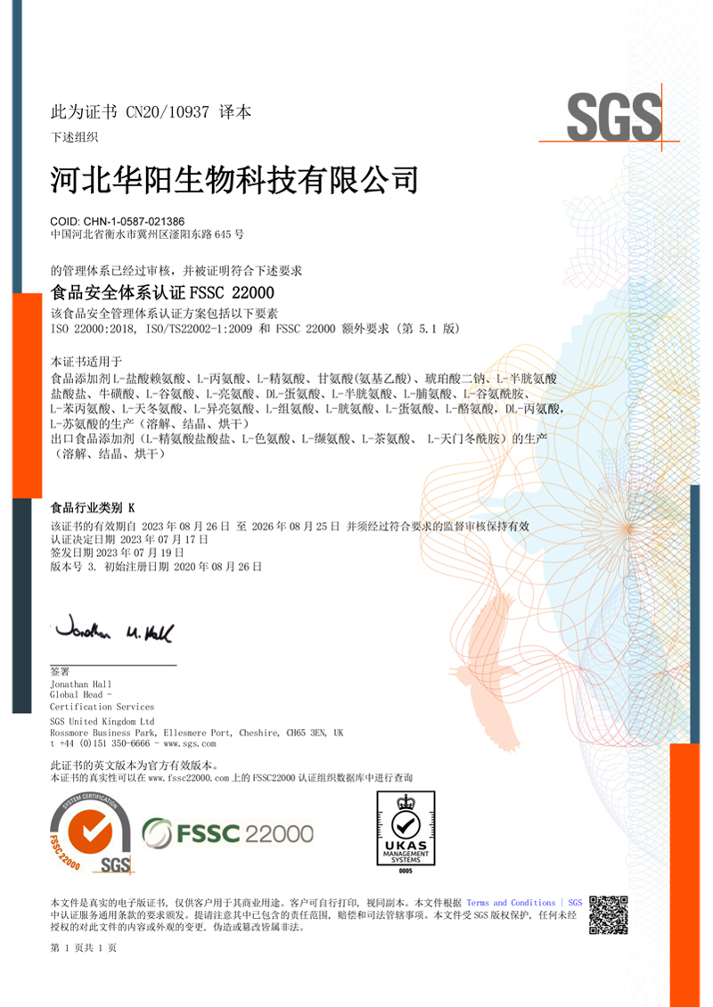河北華陽集團坐落于河北省衡水市冀州區(qū)省級工業(yè)園區(qū)(始建于1987年,前身為冀州市華陽化工有限責任公司)。集團下屬四個公司:河北華陽生物科技有限公司、河北華悅氨基酸科技有限公司、滄州華晨生物科技有限公司、衡水市陽力商貿(mào)有限公司。主要生產(chǎn)甘氨酸、L-丙氨酸、L-蘇氨酸、DL-蛋氨酸、L-賴氨酸鹽酸鹽、L-半胱氨酸鹽酸鹽、干貝素等氨基酸系列食品級產(chǎn)品,廣泛應用于食品、飲料、飼料等行業(yè)。......